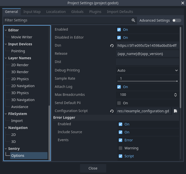 Sentry can be configured via Project Settings or in GDScript. To access project settings in Godot Engine, navigate to Project > Project Settings..., then scroll down the sections list on the left until you find the Sentry section.