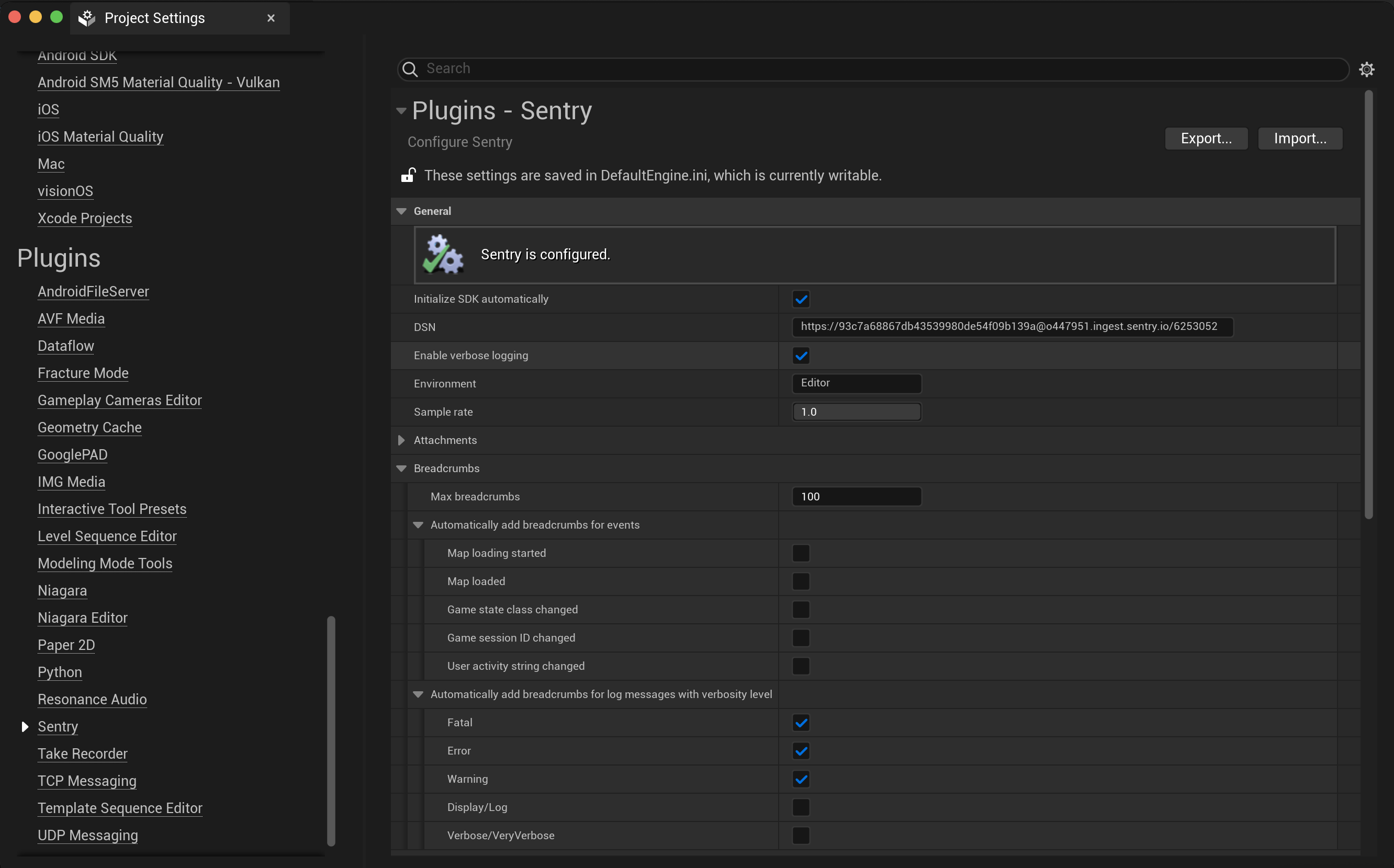 The Unreal Engine SDK can capture certain types of breadcrumbs automatically. Those can be enabled using the Sentry configuration window at Project Settings > Plugins > Sentry.