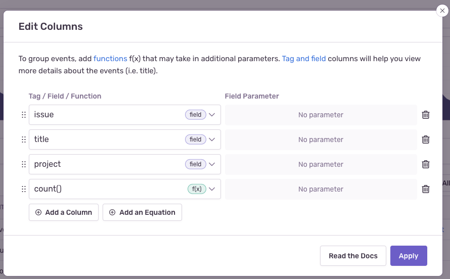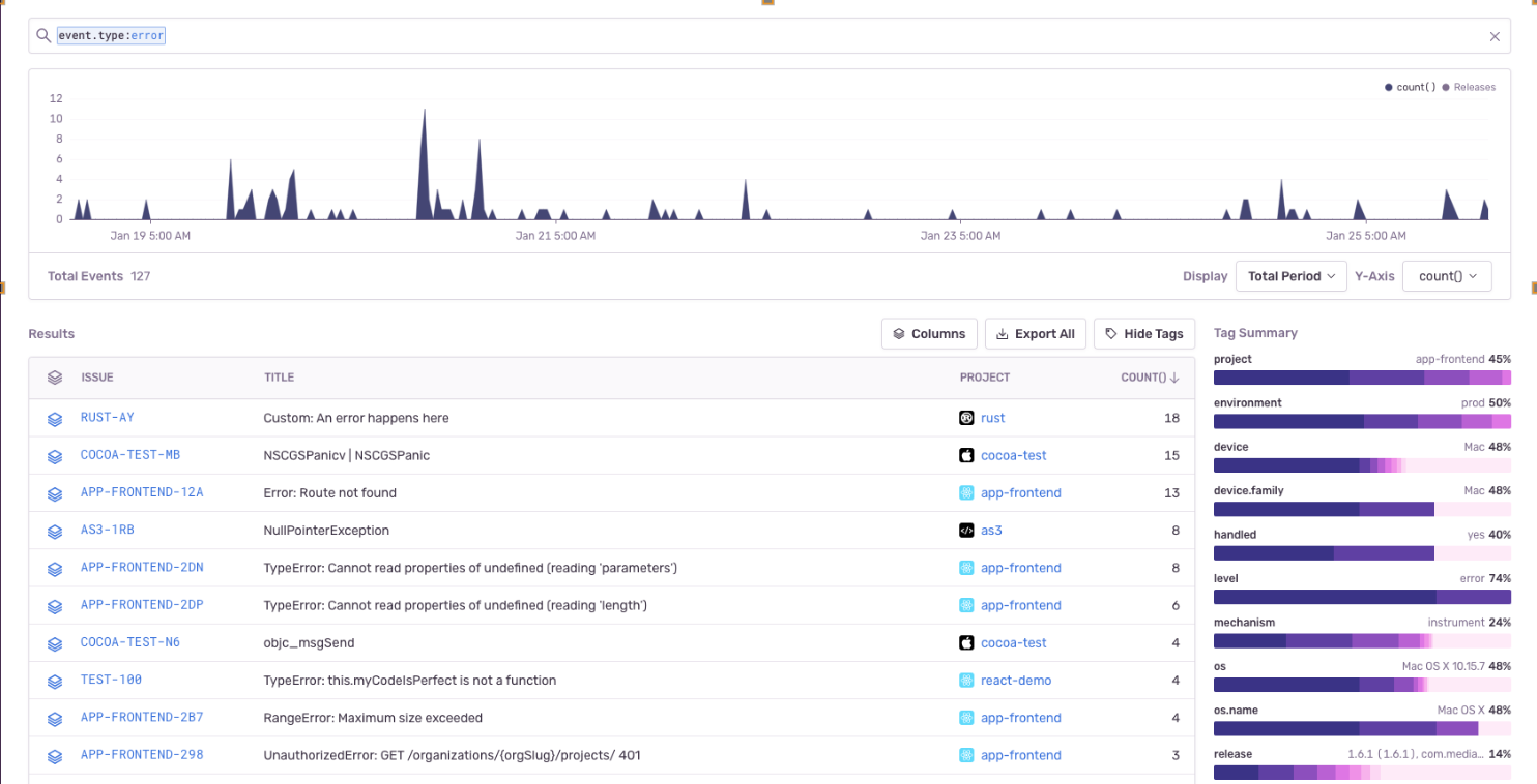 You can set up a query in Discover to take a more proactive approach to resolving your busiest issues. When you're building the query, search for event.type:error and then set the columns issue, title, project, and count(), as shown below: