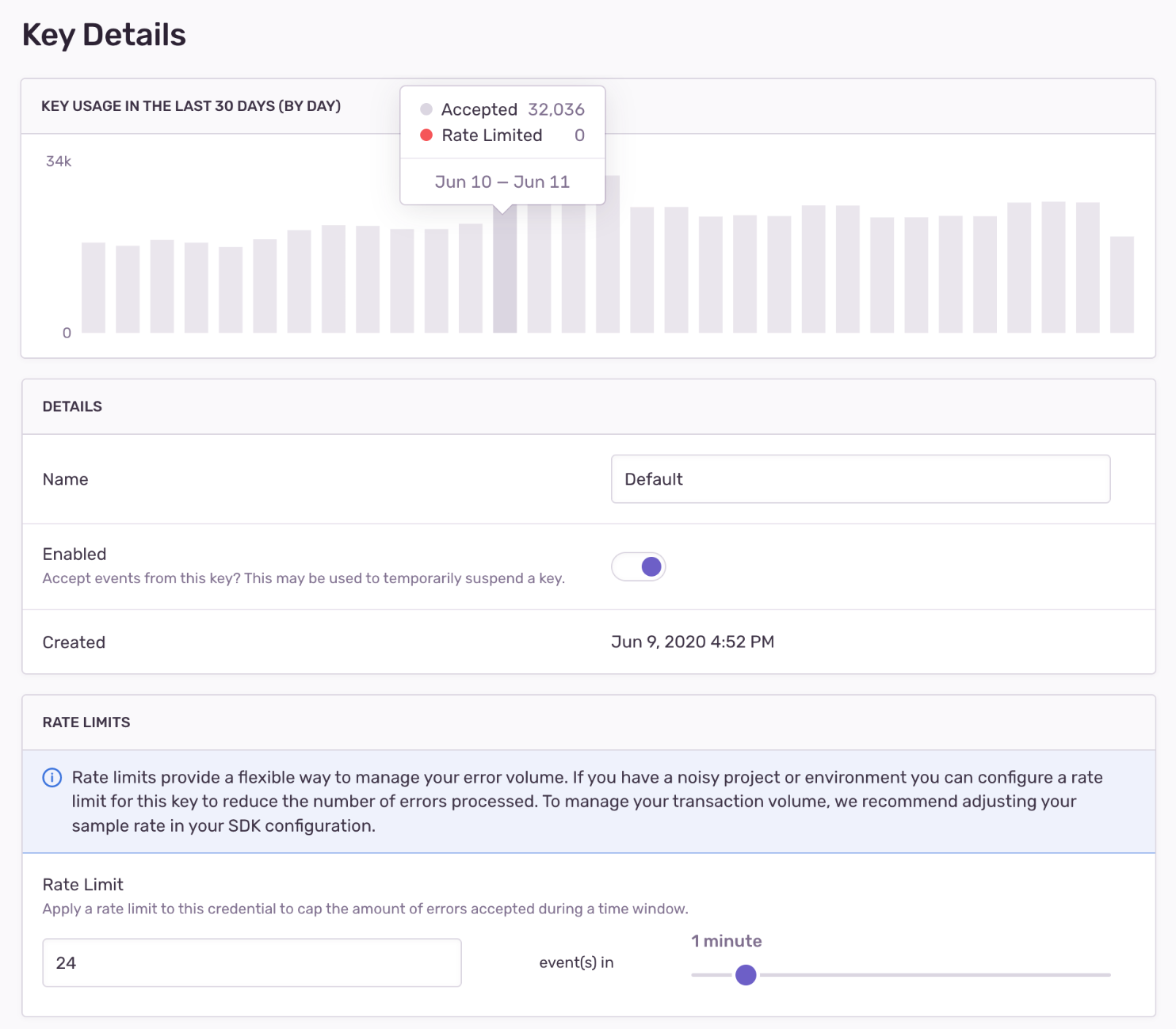 Rate limiting allows you to set the maximum volume of error events a project key will accept during a period of time. For example, if you have a project in production that generates a lot of noise, a rate limit allows you to set the maximum amount of data, such as “500 events per minute”. Additionally, you can create a second key for the same project for your staging environment, which is unlimited, ensuring your QA process is still untouched.
