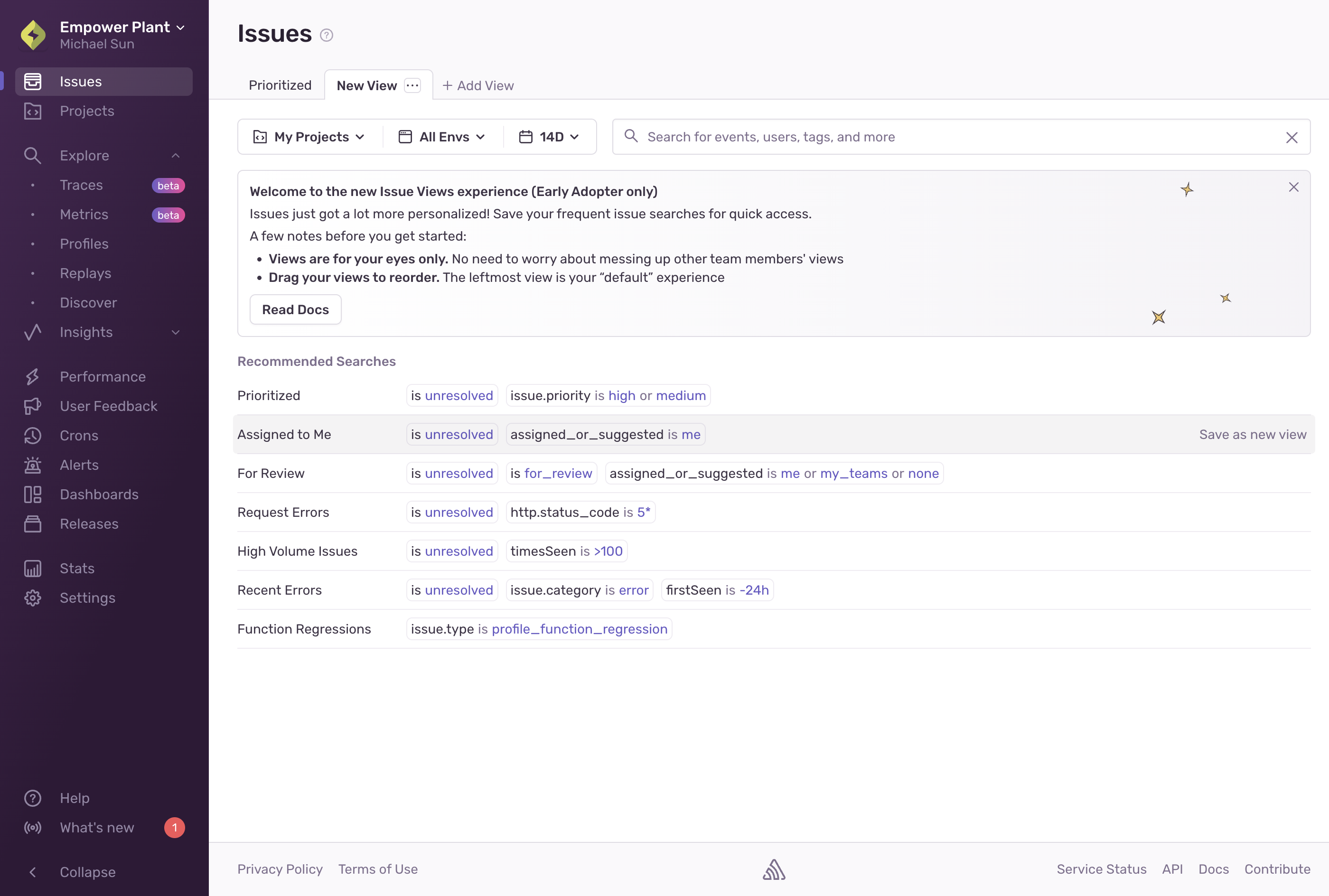 Issue views let you customize what shows up in your issue stream so you can quickly see what's most important to you. You have full control over which search query your issue stream renders by default, and which other queries are within a click's reach.
