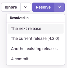 There are several options for resolving a release issue. If you'd like to leave the release issue unresolved and be notified of it the next time any event is seen in a release, click the main "Resolve" button. But if you'd like to ignore the release issue until it's seen again in your current or next release, you can select "Resolved In The next release" or "Resolved In The current release" from the dropdown.