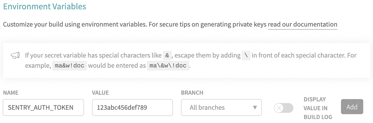 3. Add a new variable with SENTRY_AUTH_TOKEN as the name and your internal integration token as the value.